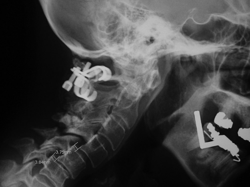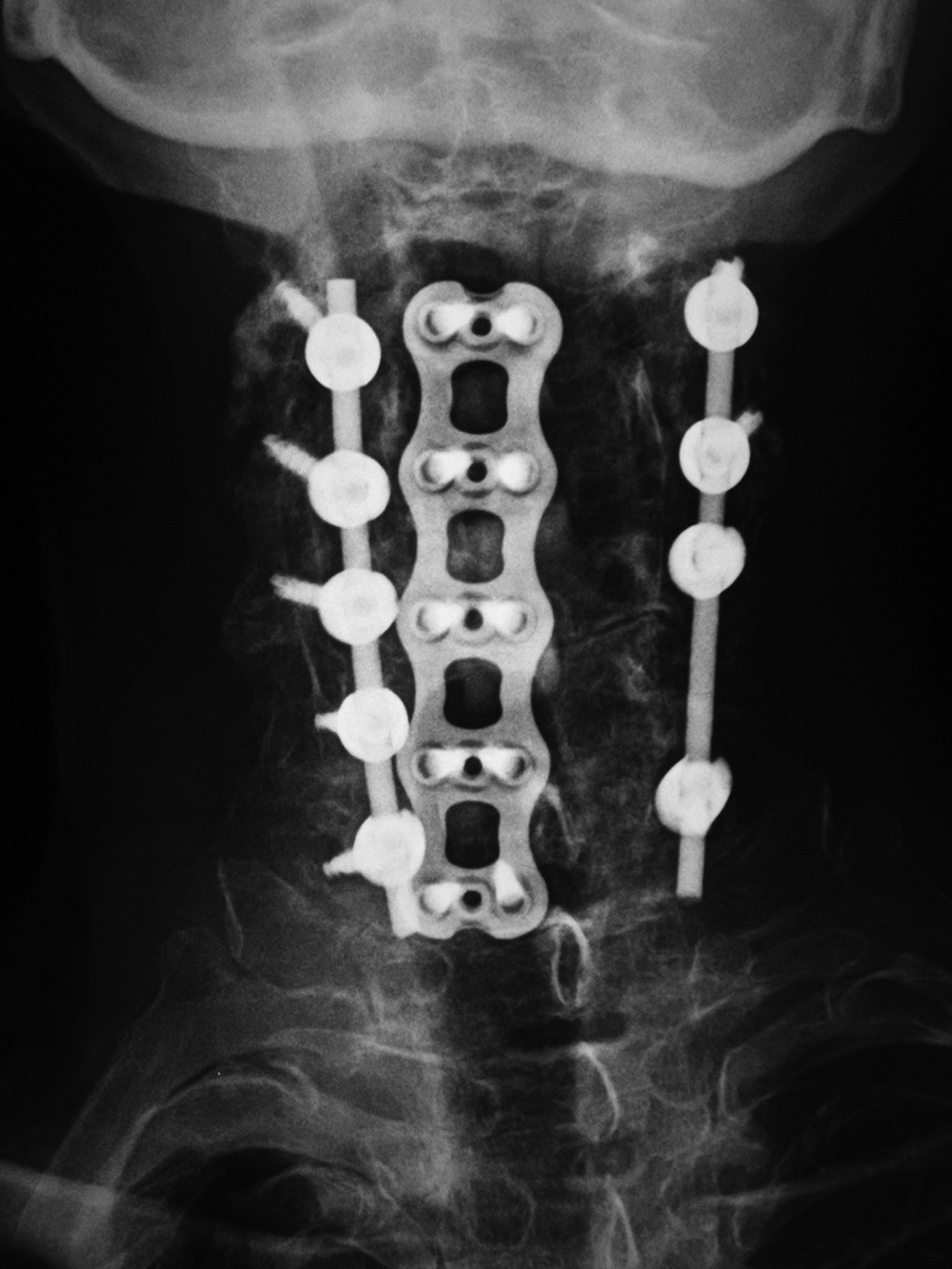 most suited for placement of pedicle screws (figure: odontoid screw (nail) fixation and posterior cervical plates; figure: anterior and posterior cervical spine fusion; figure: posterior cervical spine fusion from occiput with halo brace). Sometimes more exotic posterior cervical spine fixation may be seen, such as a posterior fixation clamp (figure: cervical spine clamp).