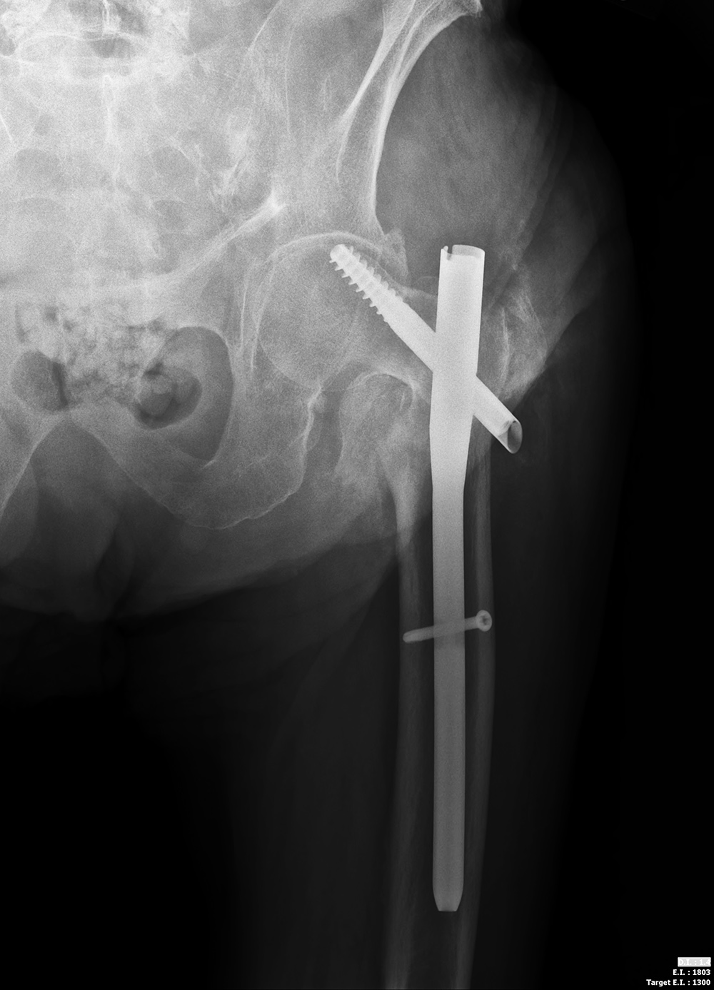 | 41 year-old man with chronic left femoral neck fracture and fracture of superior cannulated fixation screw. The partially visualized intramedullary nail is for an old femoral shaft fracture. |