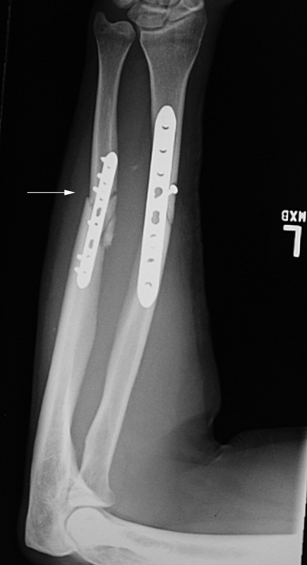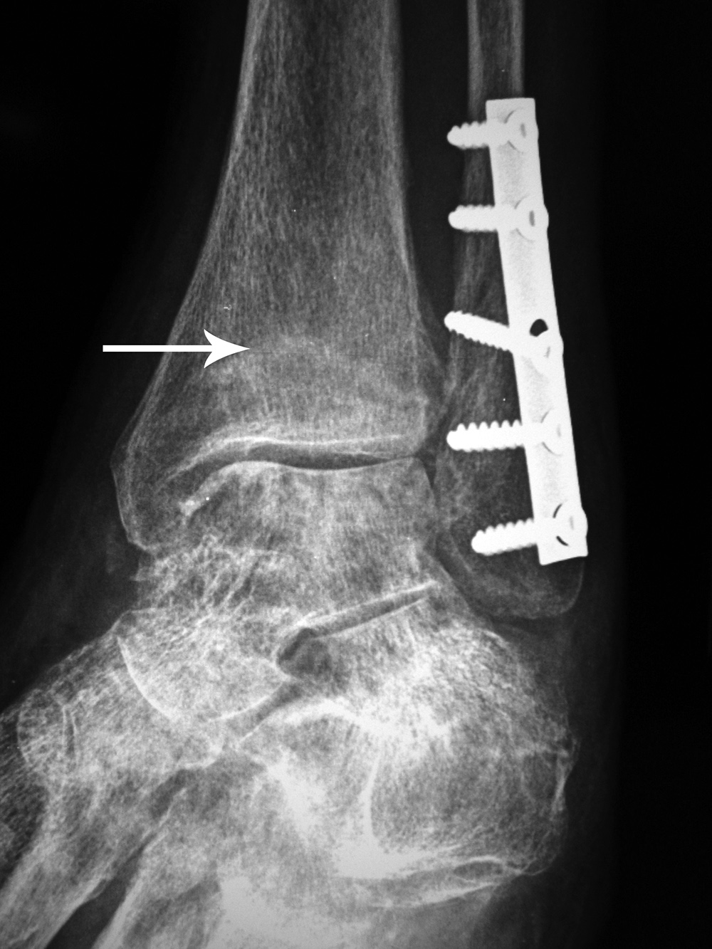 A short one-third tubular plate and screws plus interfragmentary screw stabilize a healing distal fibular fracture. An associated stress fracture (arrow) is in the distal tibial metaphysis from altered weight-bearing from the fibular fracture. |