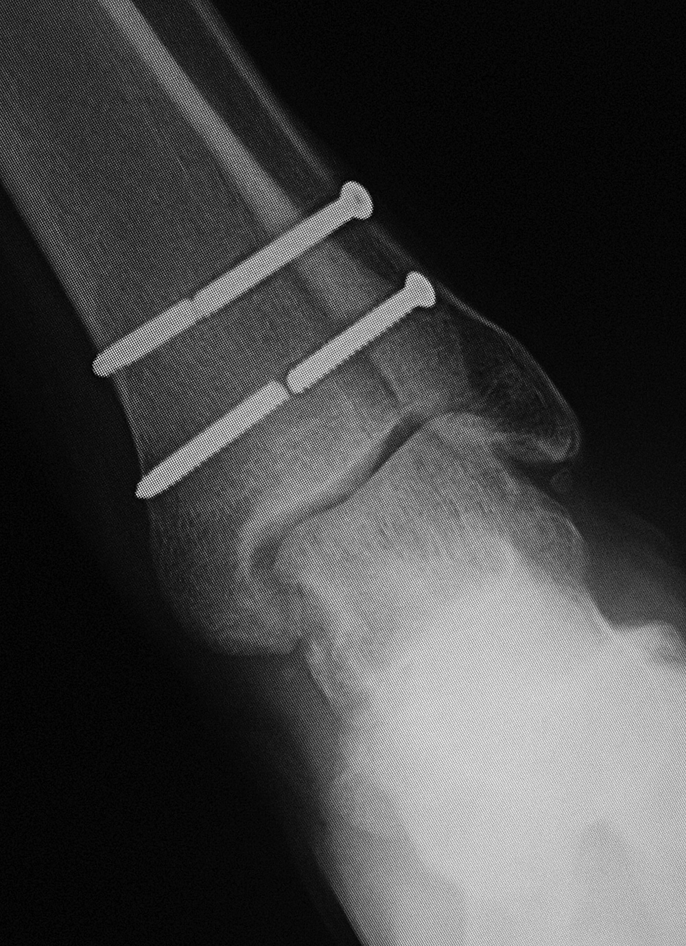 22 year-old man with syndesmotic screw placement for medial avulsive ankle injury. The screws fractured and loosened and were later removed. |