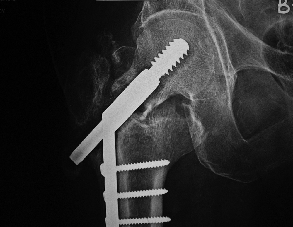 Subsequent fracture fixation failure observed as the head and neck segment of the femur flexed 90 degrees with cut-out of the screw approaching the hip joint. |