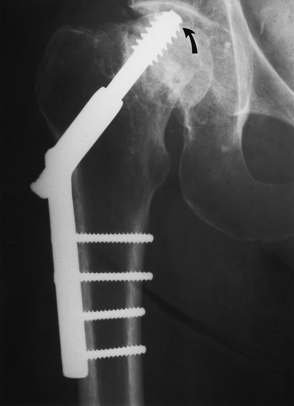 | The compression screw has slid distally in the barrel as it was designed to do when the femoral neck fracture site becomes compressed. This did not prevent the screw from cutting out of the femoral head (curved arrow). From Hunter, 1994 |