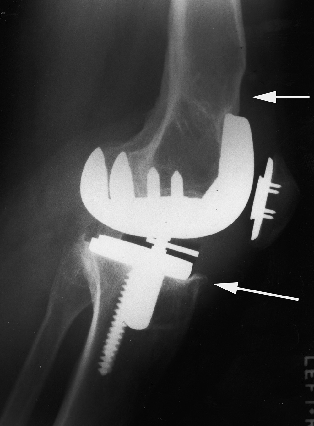 A noncemented total knee arthroplasty is present with a metal backed patellar component. There is also a polyethylene locking clip which locks the tibial polyethylene into the tibial base plate. The anterior cortex of the femur is notched and eroded (top arrow). There is also subtle subsidence of the tibial component (bottom arrow). From Benjamin, 1994 |