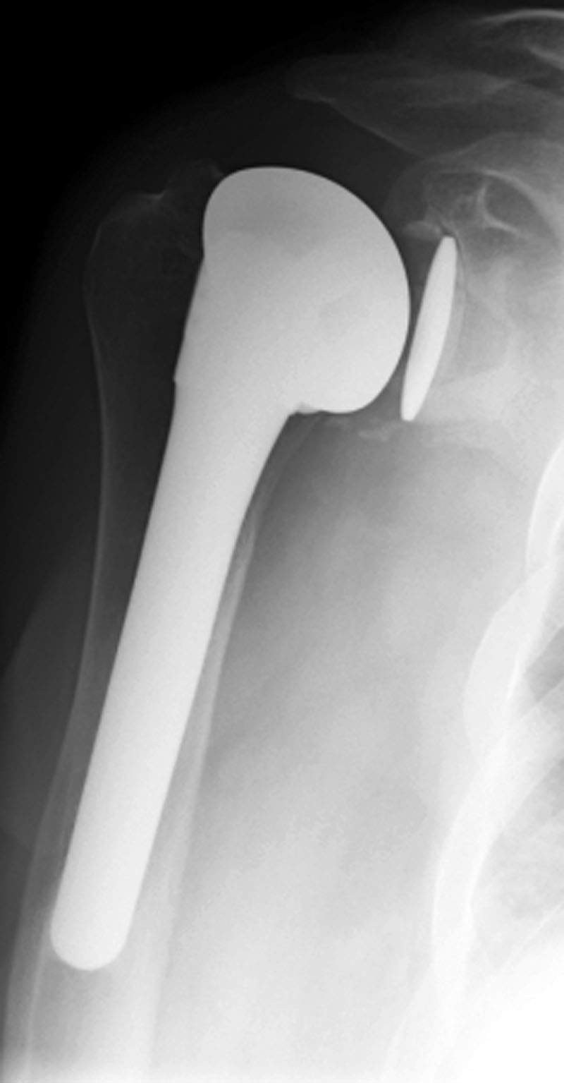 This prosthesis was placed to spare the left upper extremity after widespread surgery for a metastatic bone tumor. The native glenoid is intact and articulates with the prosthetic humeral head. |