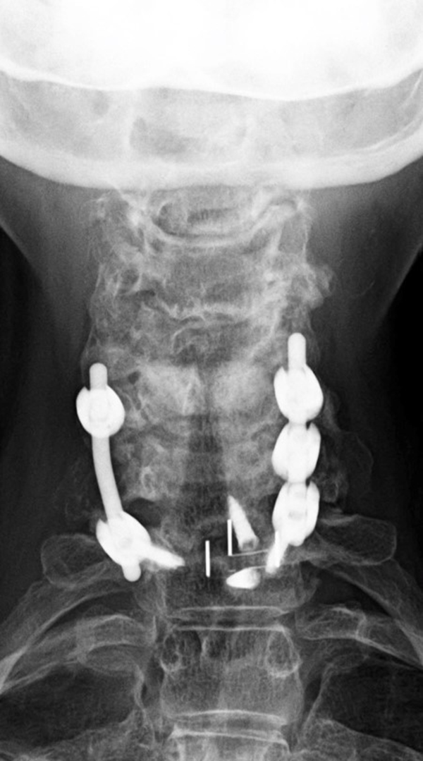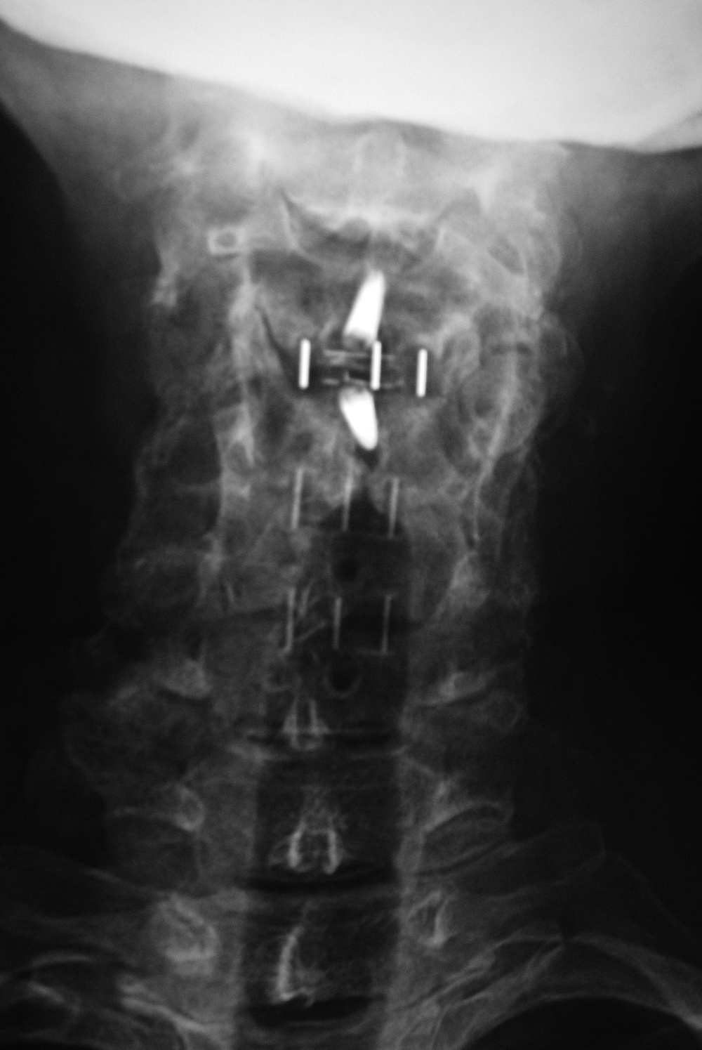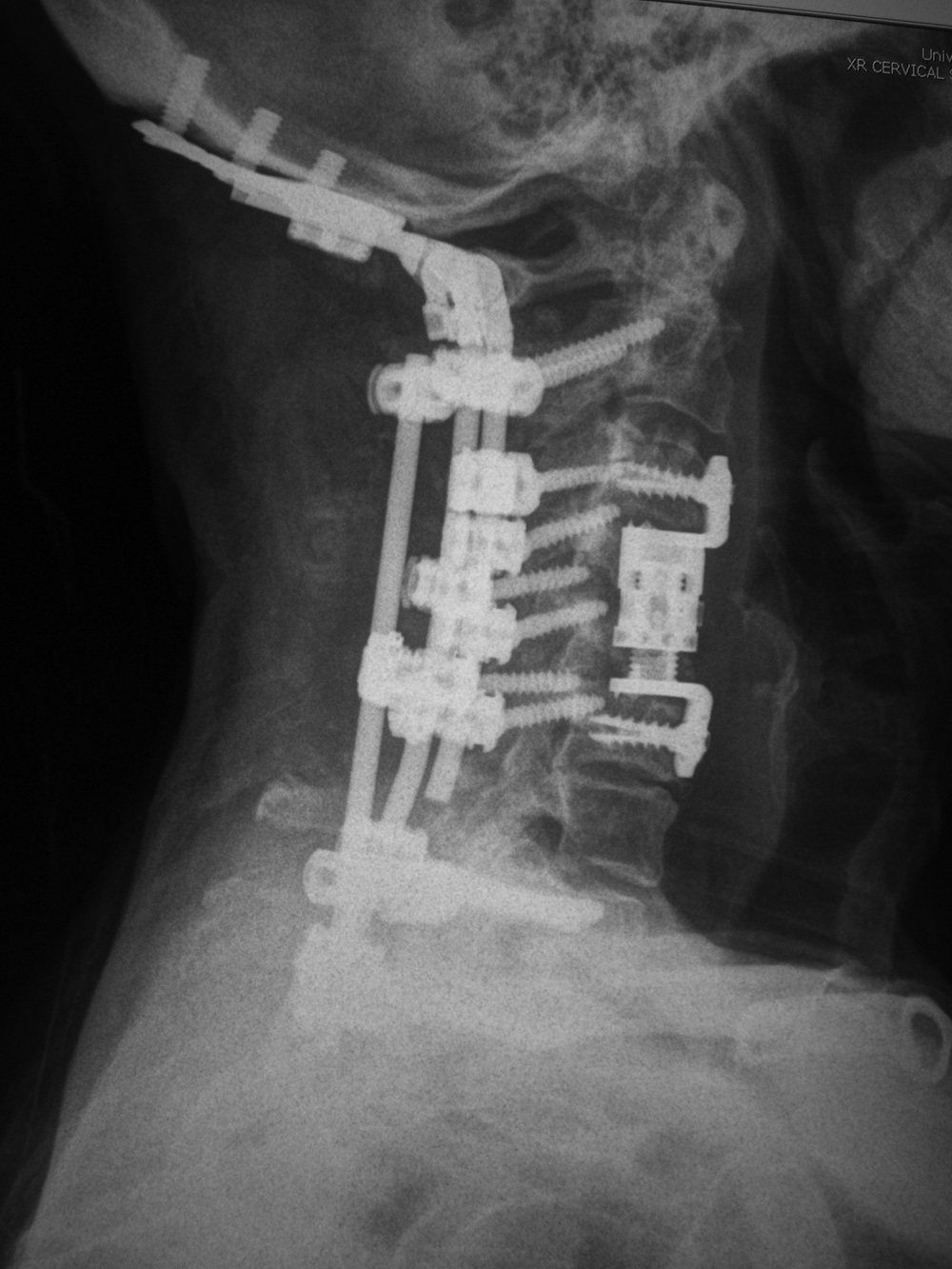 | 47 year-old woman with type III dens fracture treated by occiput-C2 fusion. |