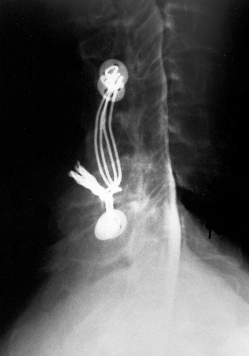 Posterior cervical wires from C4 to C7 after laminectomy. The lateral view obtained after cervical myelography. From Hunter, 1994 |