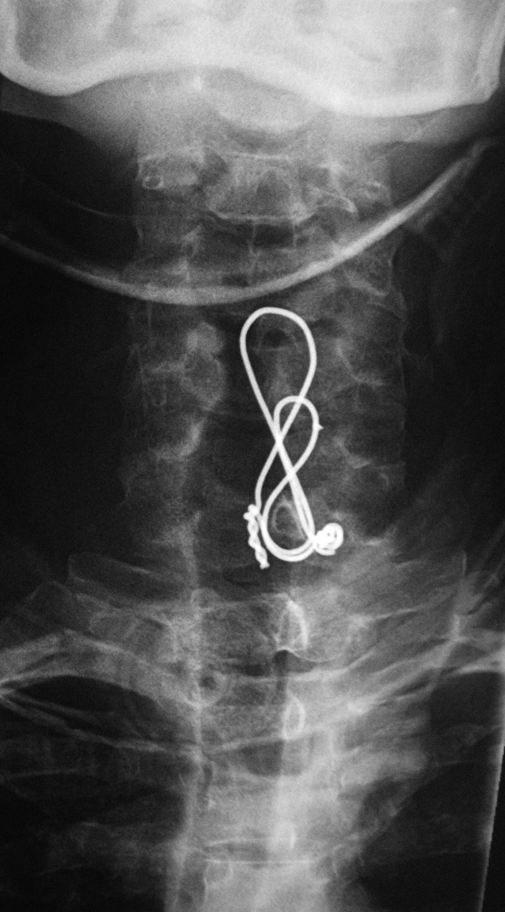 44 year-old man with C7 vertebral fracture. Posterior figure of 8 wire fixation extends from C4 to C7 |