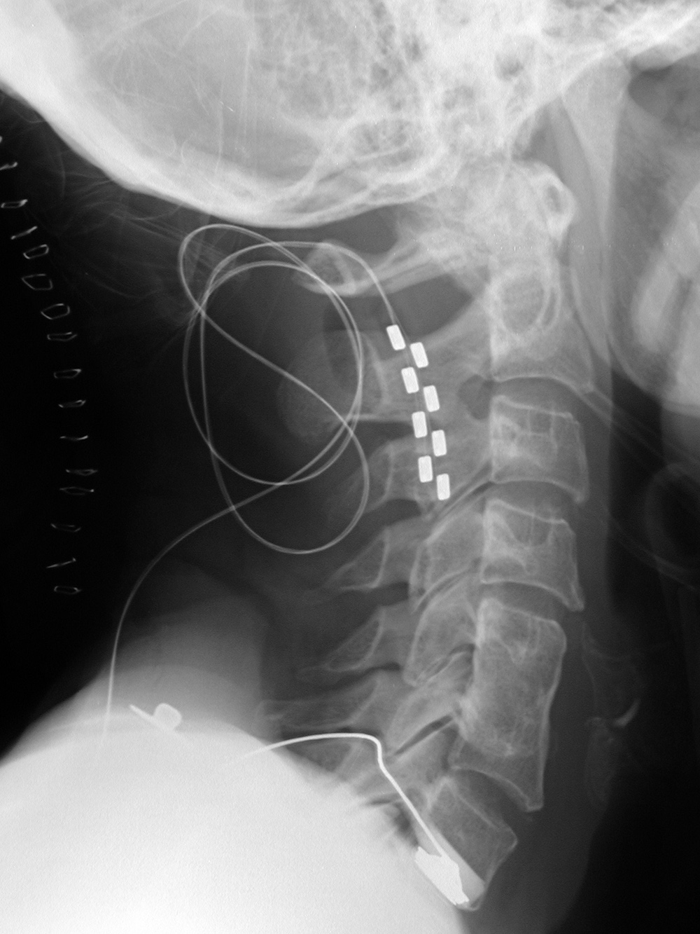 | 62 year-old man with anterior cervical fusion plate and screws C5-7 for treatment of prior cervical spine trauma. Bilateral vagus nerve stimulators were placed to treat chronic syncope.