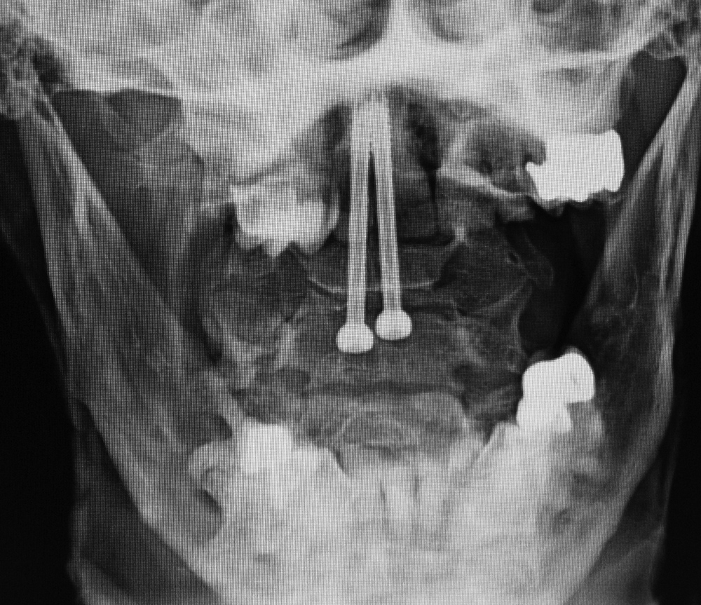 | 86 year-old woman with C1 posterior ring and type II dens fractures two months earlier treated with two odontoid (dens) screws. |