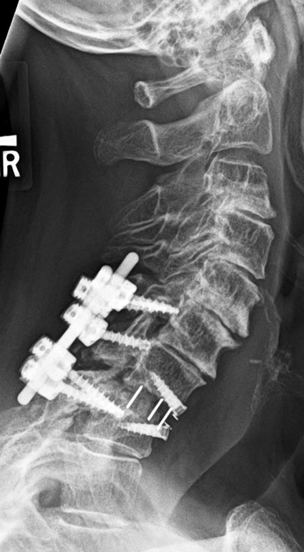 Young woman with traumatic locked facets at C6-7 and C7 body fracture. A posterior cervical fusion with lateral mass screws (cervical spine) and pedicle screws (thoracic spine) and rods extends from C4 to T2. There is an anterior cervical fusion plate and screws at C6-7 with a intervertebral disk cage at C6-7 and a crosslink at C6. |
