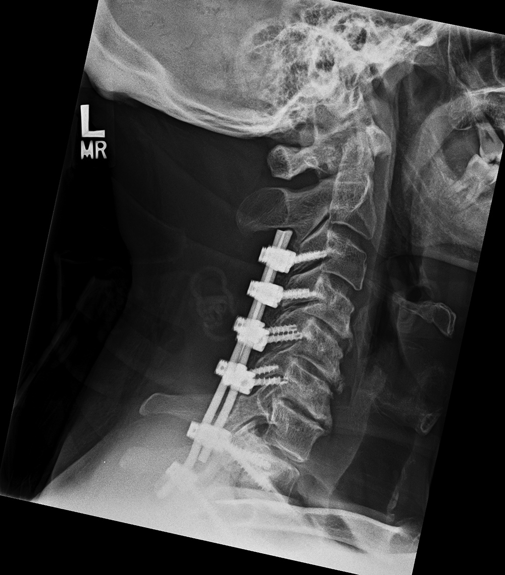 | There is also an anterior cervical fusion plate and screws from C3-6. |