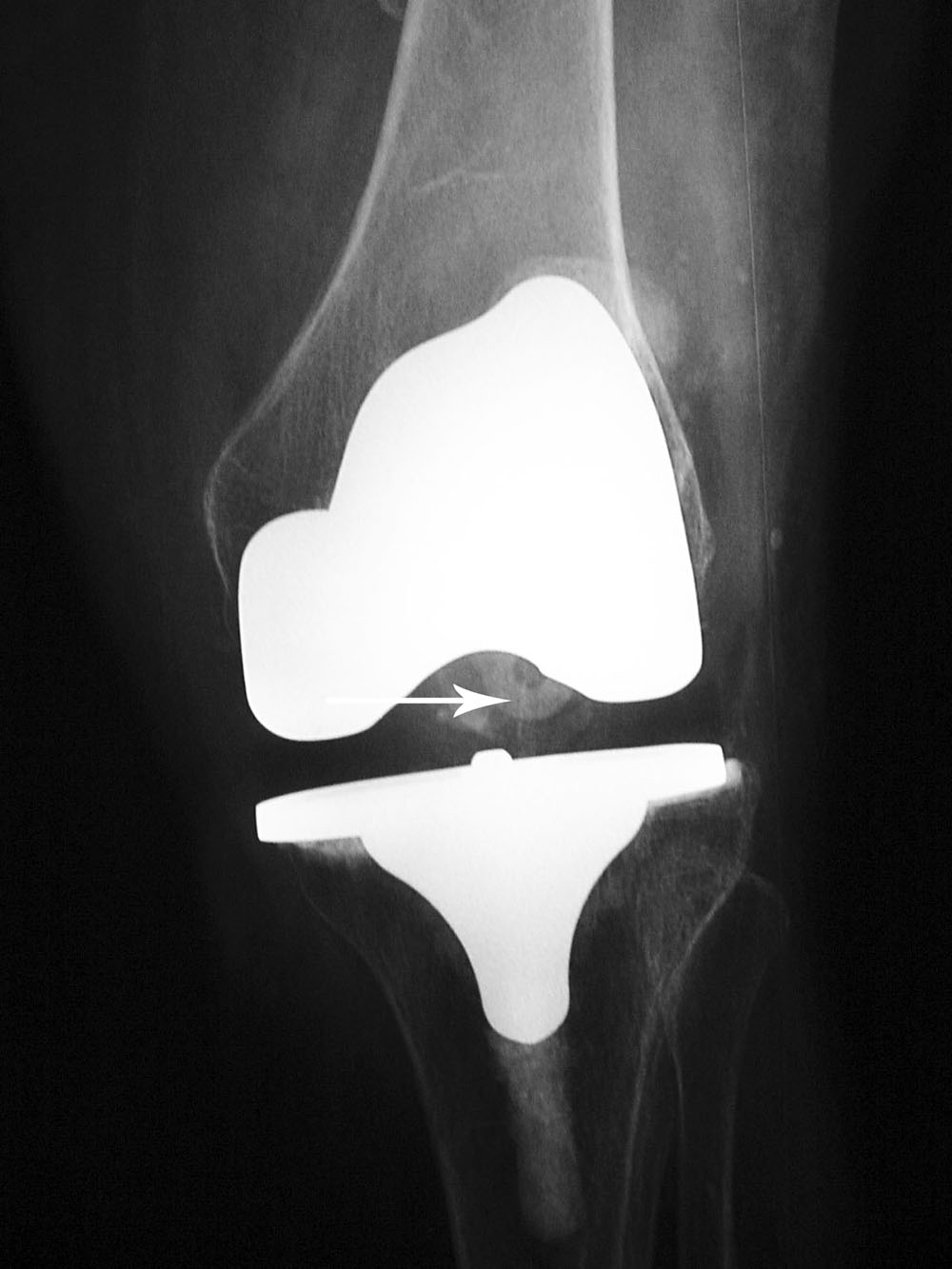 The patellar component (button) is dislocated inferiorly (arrow) |