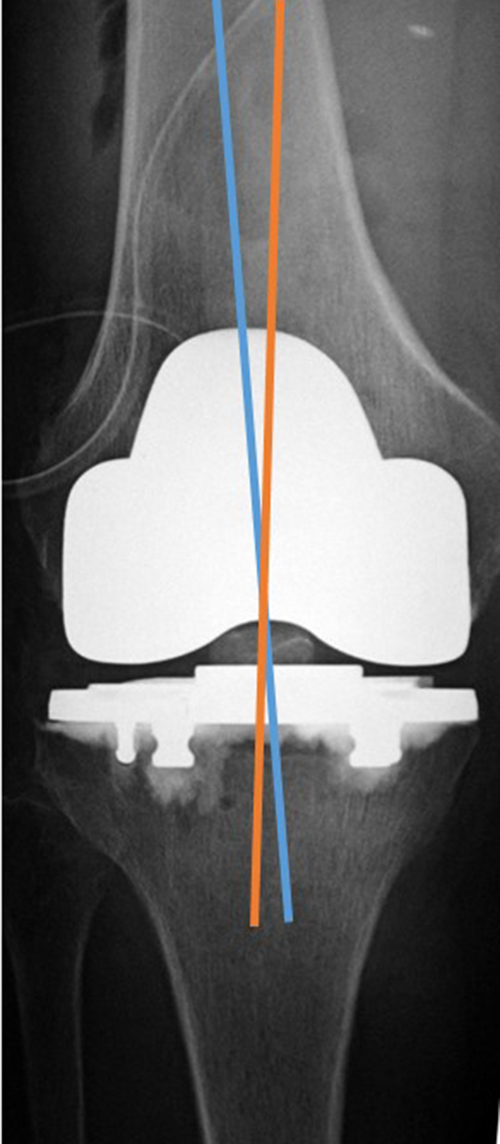 While the orientation of various knee arthroplasty designs vary, more than 5° of varus or valgus of the