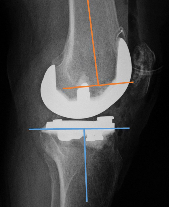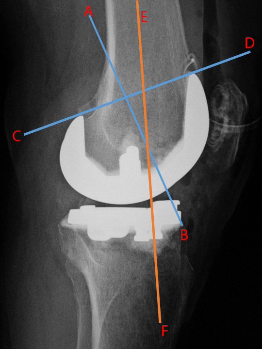 The angles and measurements for radiographic evaluation of a total knee prosthesis can rapidly become very complex and confusing with slight differences in how axes and angles are measured from observer to observer. CT is necessary for specifically evaluating the rotational alignment in a total knee arthroplasty (Mulcahy, 2013). In most instances, it is probably best to evaluate a knee prosthesis subjectively looking for overt signs of misplacement or other complications rather than worrying about detailed measurements.
